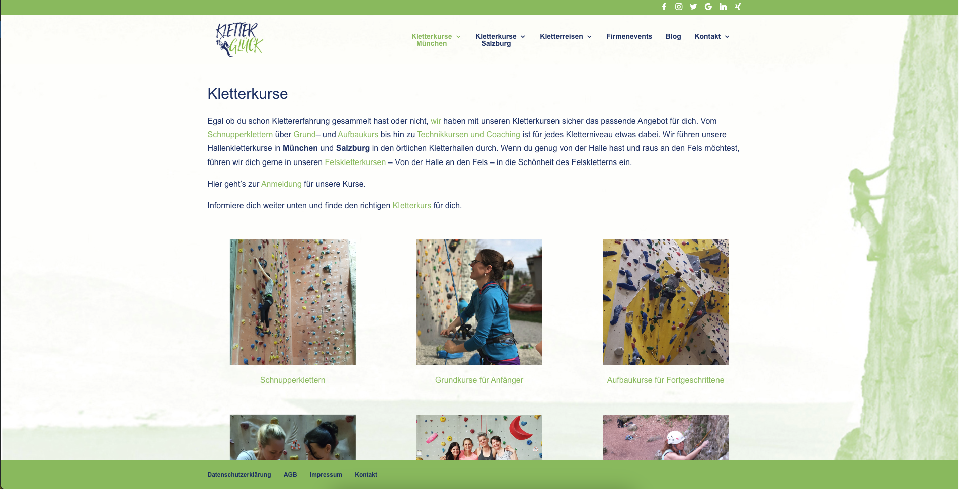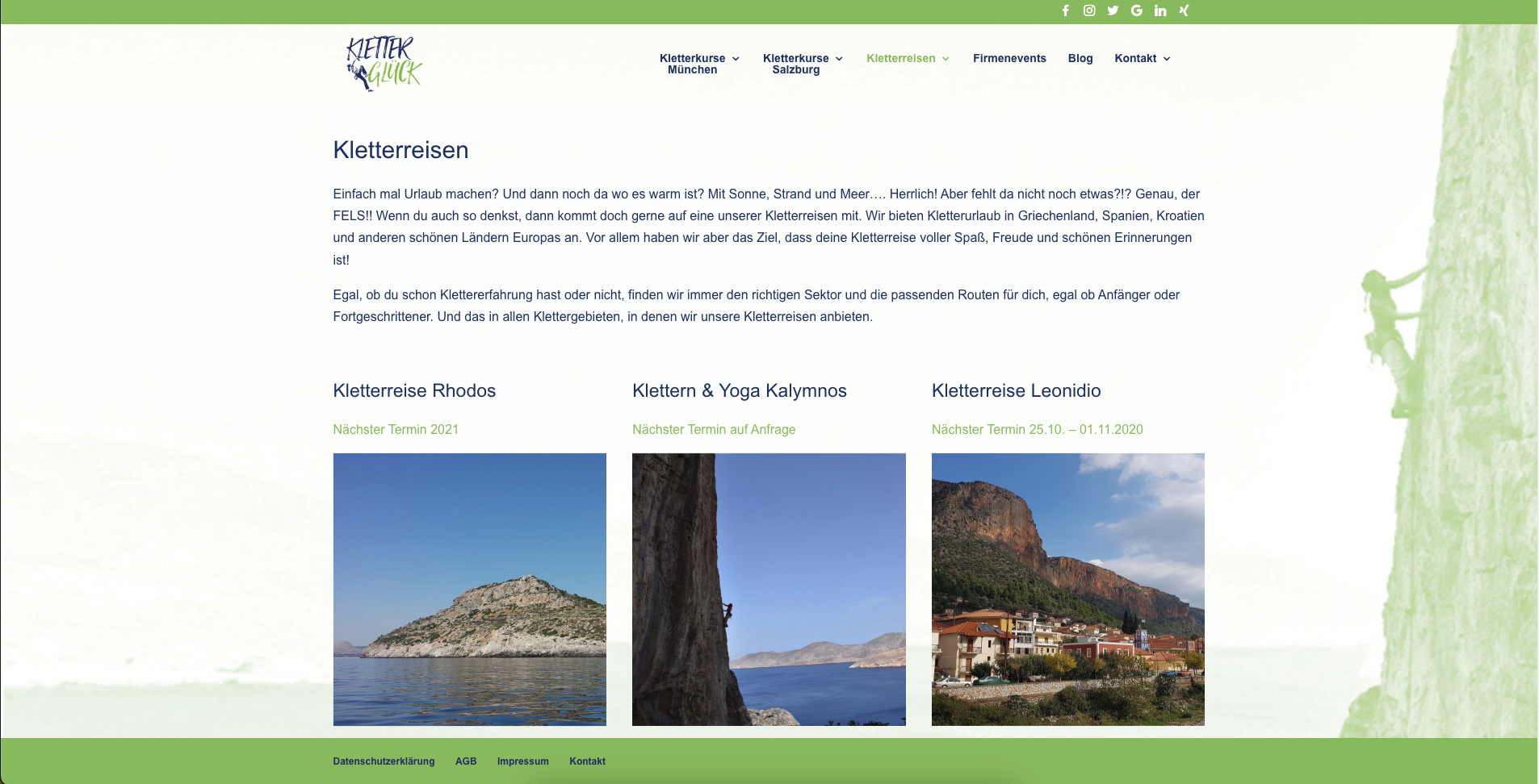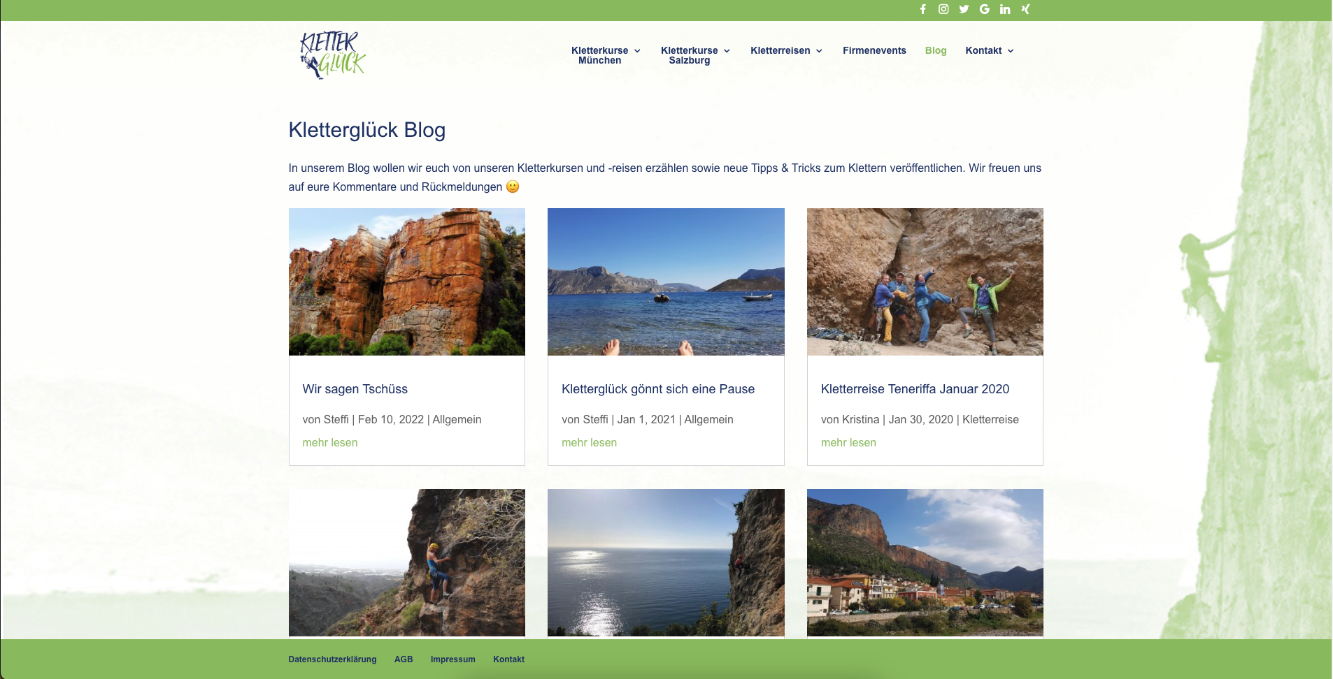 In den Jahren 2017 – 2020 habe ich die Webseite meiner Kletterschule kontinuierlich aufgebaut und erweitert: mein erstes großes Projekt und dann noch für mich selbst. Die Seite enthielt relative viele Unterseiten mit einer Beschreibung der Kletterkurse und Kletterreisen, die Möglichkeit der Buchung bzw. Anmeldung zu diesen Kurse. Ebenso war eine Anmeldung zum Newsletter möglich (MailerLite), die sowohl über ein Popup als auch direkt als Formular aufzurufen war. Das Kontaktformular und auch das Buchungsformular wurden ebenso umgesetzt. Um einen besseren Einblick in die Kletterglück-Welt zu geben, habe ich auch immer wieder Blogeinträge verfasst, die ebenso Teil der Webseite waren.
