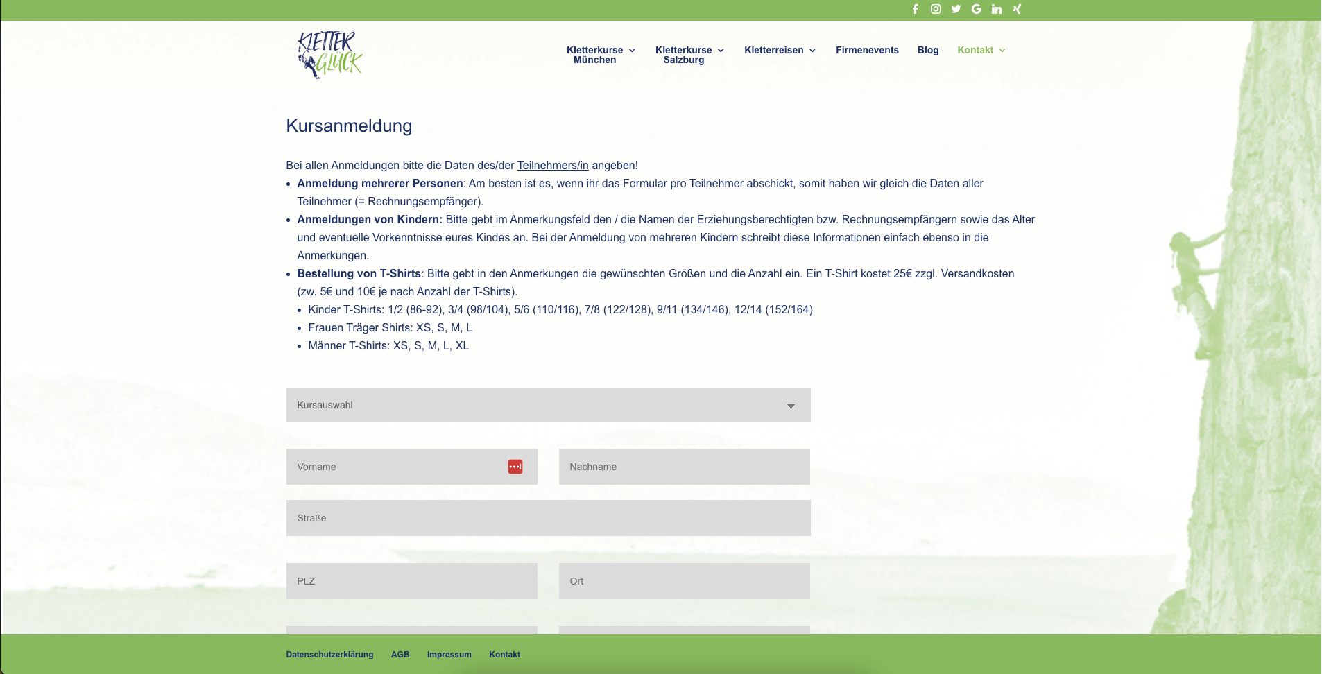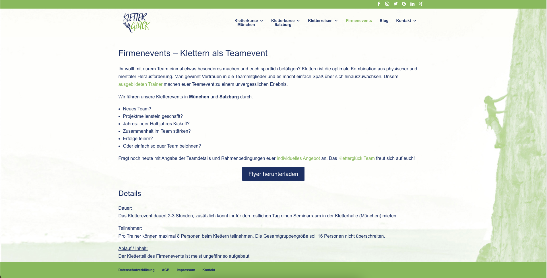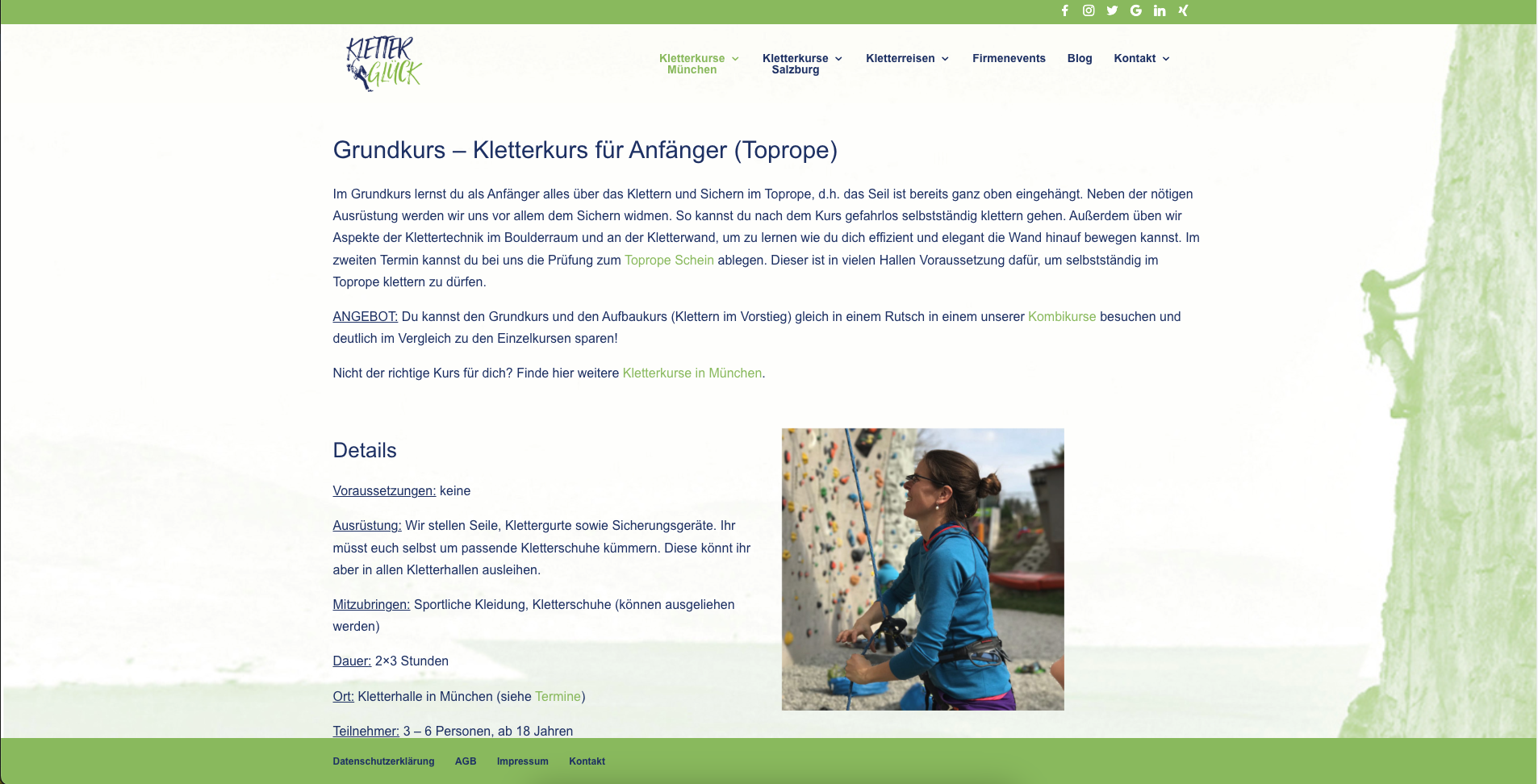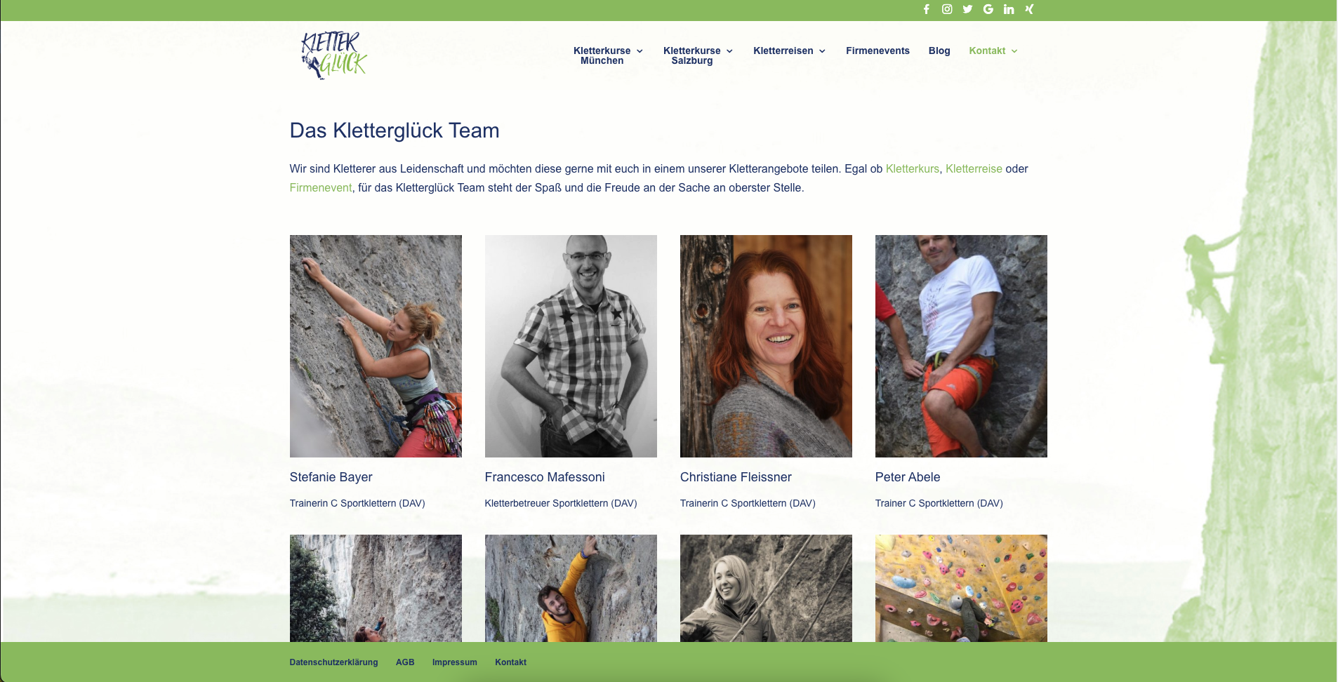 In den Jahren 2017 – 2020 habe ich die Webseite meiner Kletterschule kontinuierlich aufgebaut und erweitert: mein erstes großes Projekt und dann noch für mich selbst. Die Seite enthielt relative viele Unterseiten mit einer Beschreibung der Kletterkurse und Kletterreisen, die Möglichkeit der Buchung bzw. Anmeldung zu diesen Kurse. Ebenso war eine Anmeldung zum Newsletter möglich (MailerLite), die sowohl über ein Popup als auch direkt als Formular aufzurufen war. Das Kontaktformular und auch das Buchungsformular wurden ebenso umgesetzt. Um einen besseren Einblick in die Kletterglück-Welt zu geben, habe ich auch immer wieder Blogeinträge verfasst, die ebenso Teil der Webseite waren.